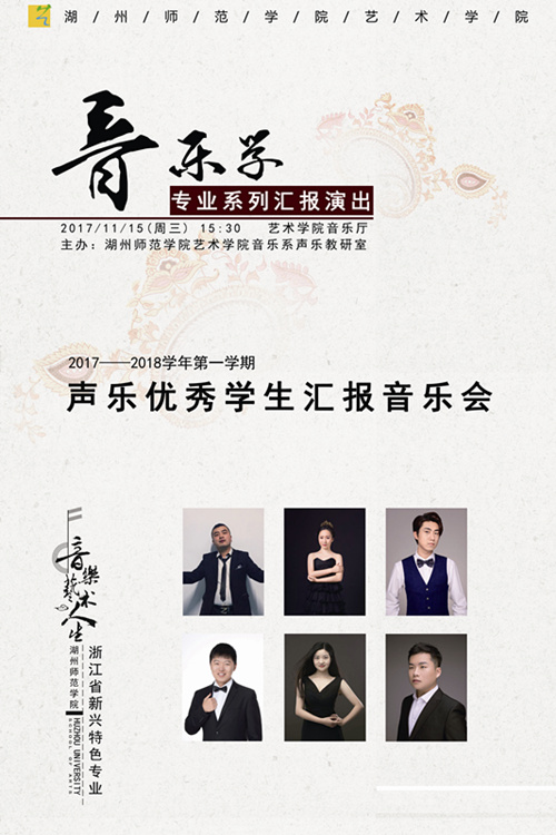 11月15日15:30,由艺术学院音乐系声乐教研室组织的“2017-2018学年第一学期声乐优秀学生汇报音乐会”在音乐厅如期举行,参加本次汇报的学生是15、16级选修声乐主项在班级名列前茅的6名学生,他们每人各演唱了2首中外艺术歌曲或咏叹调,通过这种舞台汇报形式的演唱,不仅锻炼了学生音乐专业主项技能的表演能力,也为新生树立了专业学习的方向。