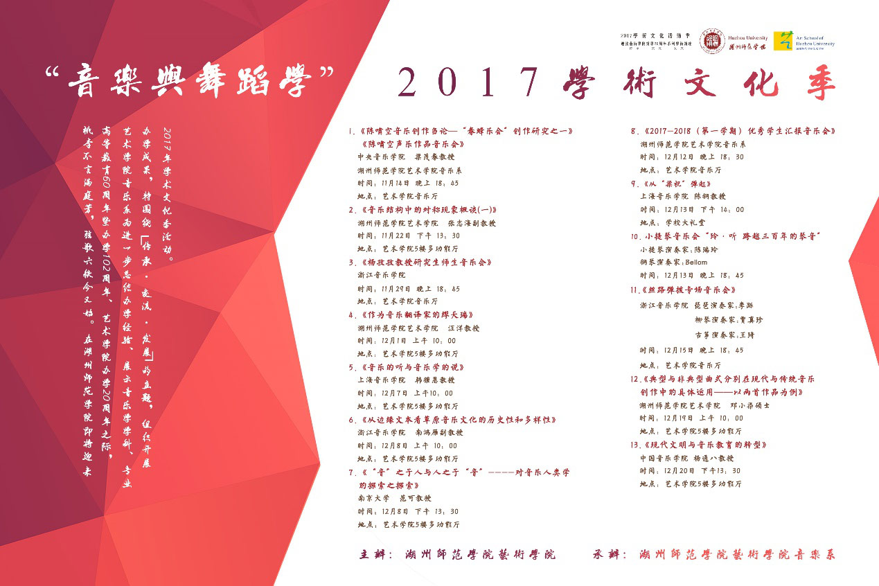 “桃李不言满庭芳,弦歌六秩今又始”,在湖州师范学院即将迎来高等教育60周年暨办学120周年、艺术学院办学20周年之际,艺术学院音乐系为进一步总结办学经验、展示音乐学学科、专业办学成果,特围绕“传承、交流、发展”的主题,组织开展2017年学术文化季活动。