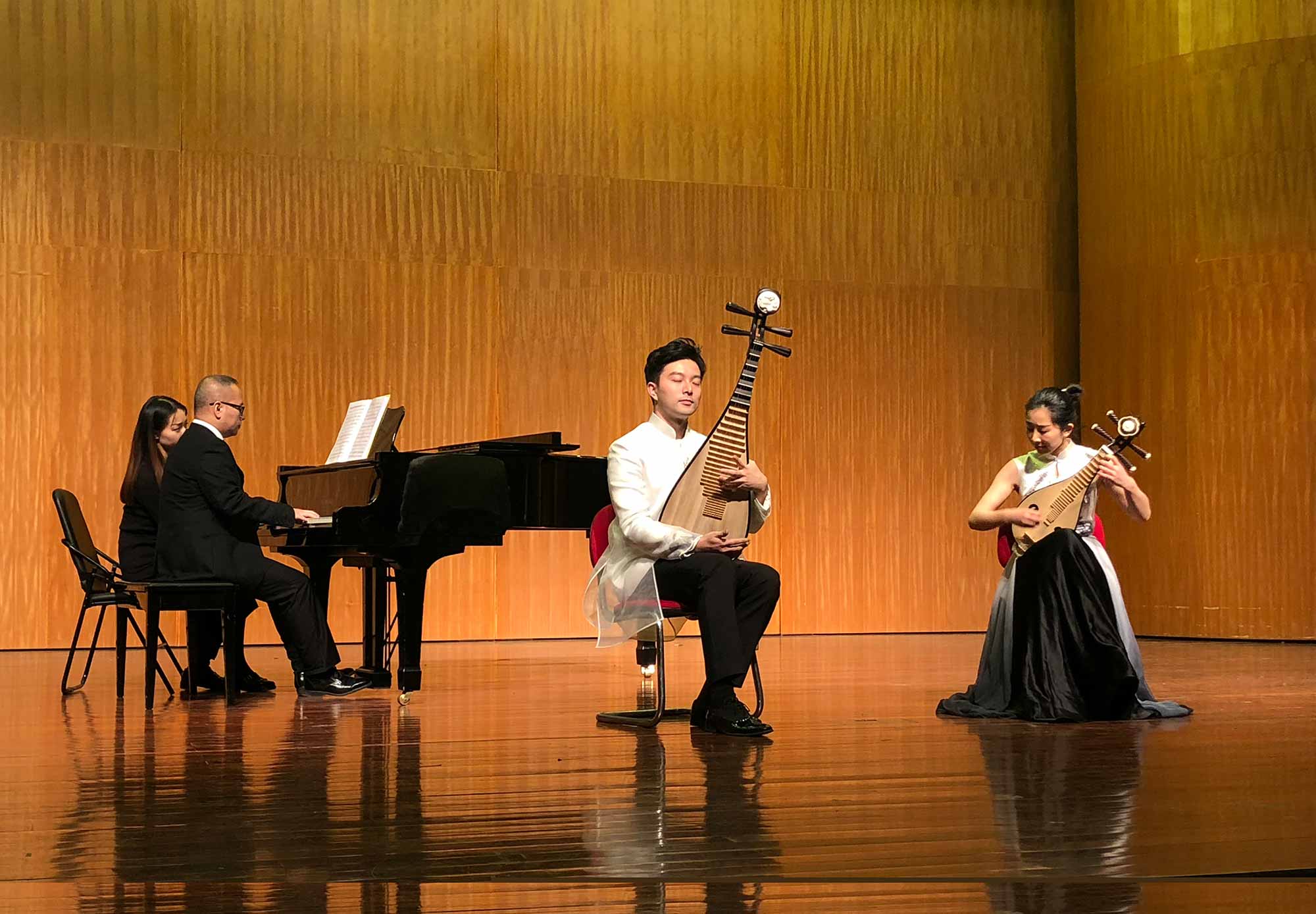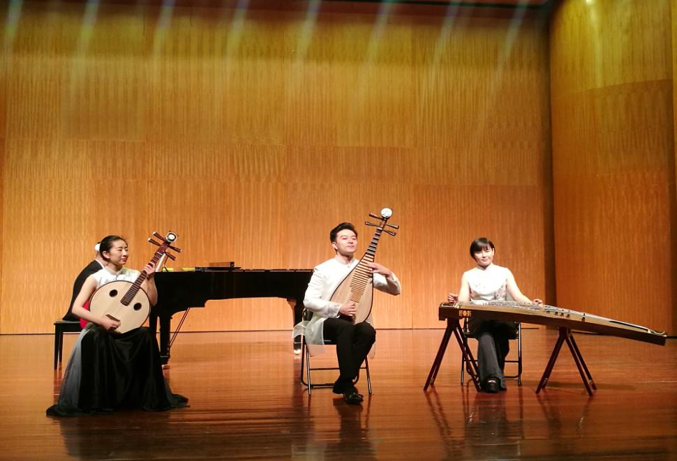 在音乐会上,他们演奏了具有浓郁西北风情的中阮独奏《丝路驼铃》、古筝独奏《秦土情》、琵琶与柳琴《楼兰意象》;具有古朴典雅风格的琵琶独奏《云想花开》和《霸王卸甲》、柳琴独奏《剑气》;同事还演奏了具有现代风格的古筝独奏《映水心莲》和古筝、柳琴、钢琴、琵琶四重奏《北京一夜》。四位演奏家演奏技艺高超、乐曲处理细致,整场音乐会更显精妙绝伦,使我校师生感受了一次高水平的民族音乐表演,受益匪浅。