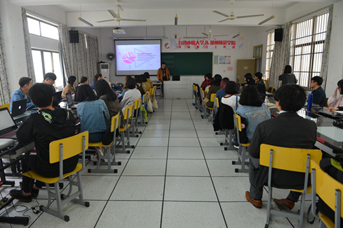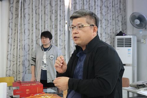 欢迎仪式后,双方师生来到上课地点,由老师开始授课。首先,我校的韩超老师给大家分享“匠人精神的现在时”的课题,分别从概念略述、问题缘起、三者关系,即传统民间工艺美术、文化创意和匠人精神之间的关系,文化更新、更新之路几个方面展开具体演讲。