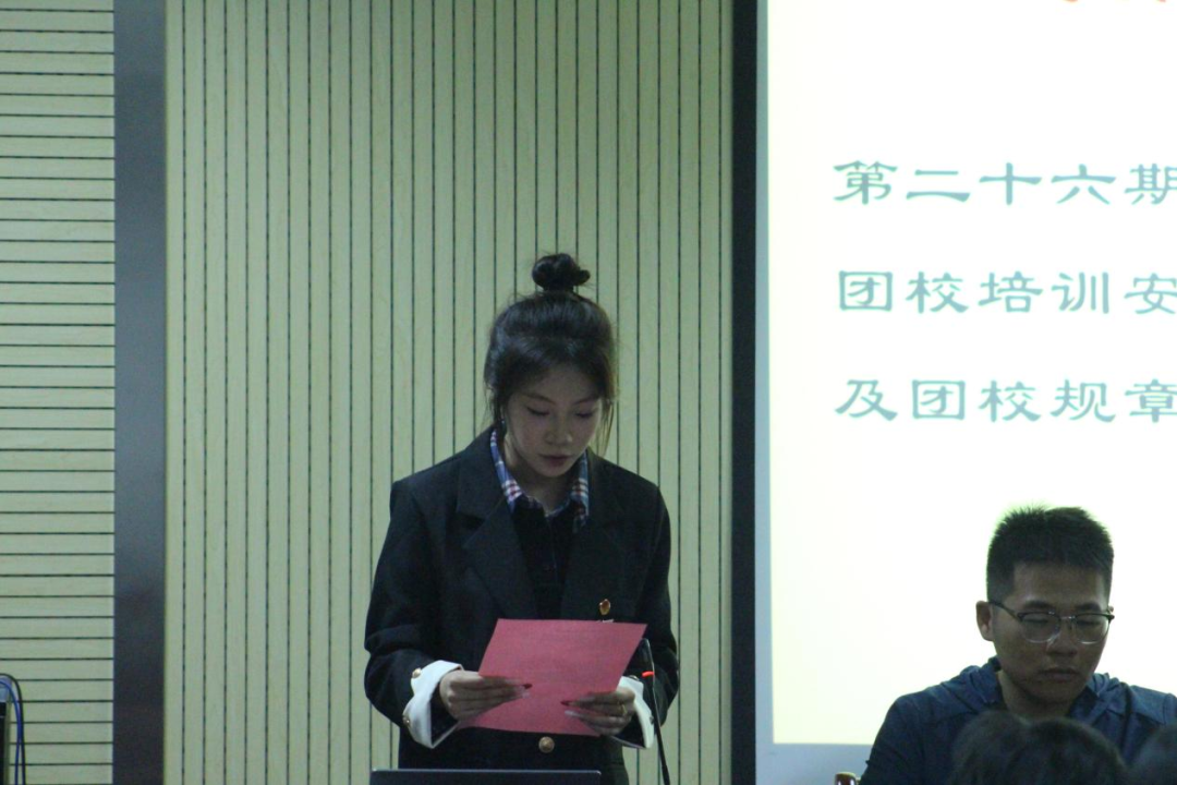 学院团委组织部部长赵雅轩同学宣读了第二十六期青年团校培训安排及团校规章制度。本期团校共有 104 名学员,分为三个班级,由优秀学生干部担任班主任,优秀团员担任班长。这一安排旨在为学员们提供更好的学习指导和榜样示范,帮助他们明确学习目标,更好地提升自己的思想政治素质。