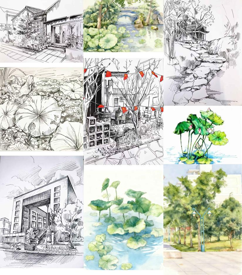 随后几日,同学们走进莲花庄、飞英公园等江南园林代表地。莲花庄以碧水、红莲、奇石闻名;飞英公园则以宋式建筑围绕荷塘而建,亭台楼阁错落有致,小桥流水相映成趣,颇具江南园林的婉约与雅致。同学们在粉墙黛瓦、亭台廊桥之间寻找灵感,创作具有文化辨识度的灵动作品。
