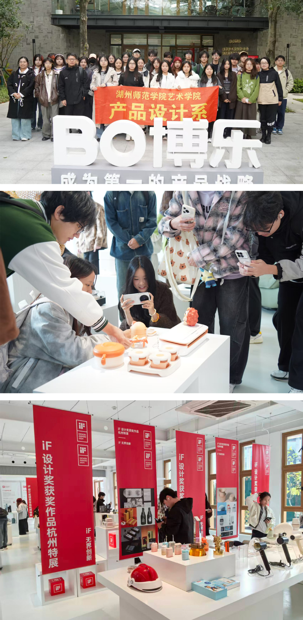 结合产品设计专业特点,本次实践活动中还特别安排了一次富有意义的校外考察环节。10月21日,全体师生前往位于杭州的国家级工业设计中心——杭州博乐工业设计有限公司,开展交流学习,并参观了德国IF设计奖获奖作品展。同学们不仅深入了解了博乐公司的爆品打造模式,还通过赏析国际级获奖作品,拓展了设计视野,汲取了现代设计语言,为今后的设计创作注入了全新灵感。