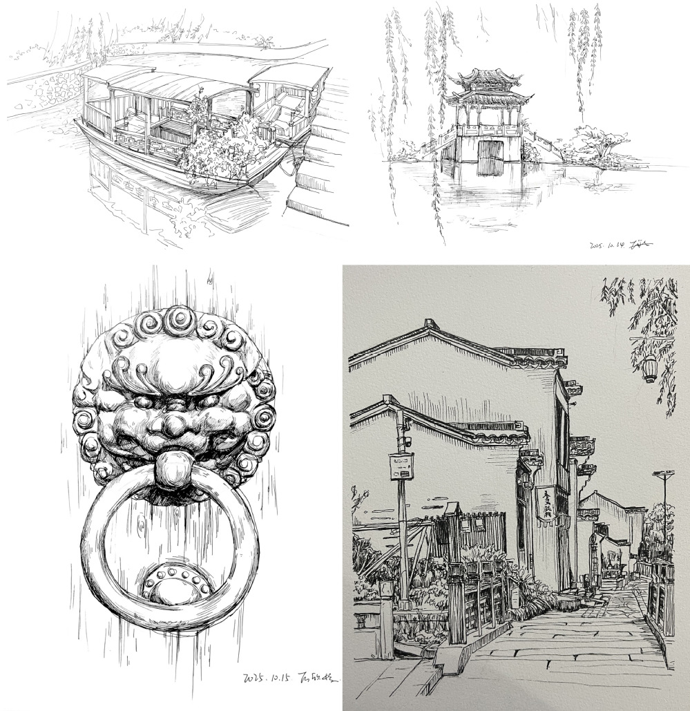 2025年10月13日—10月24日,2024级产品设计专业学生在湖州多地开展了 “传统技艺与文化考察”实践活动。本次活动由盛传新老师带队,围绕“传统文化·城市寻迹”主题,深入西山漾、莲花庄、飞英公园、潞村等多个区域,带着设计视角,进行兼具写实性、信息探究性与设计思考的写生与调研,为后续创作积累可落地素材。