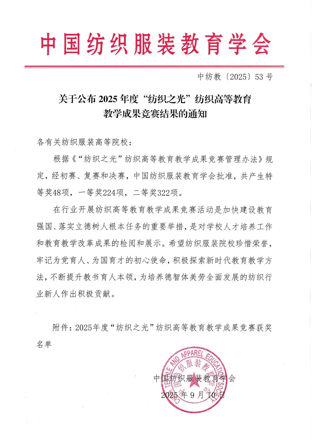 近日,2025年度“纺织之光”纺织高等教育教学成果竞赛官方获奖名单正式发布,我院服装设计系申报的《产教学研多维联动下的服装创新人才培养体系》成功斩获全国一等奖,标志着我院在人才培养领域的探索与实践获得行业权威认可。