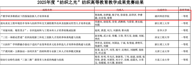 近日,2025年度“纺织之光”纺织高等教育教学成果竞赛官方获奖名单正式发布,我院服装设计系申报的《产教学研多维联动下的服装创新人才培养体系》成功斩获全国一等奖,标志着我院在人才培养领域的探索与实践获得行业权威认可。