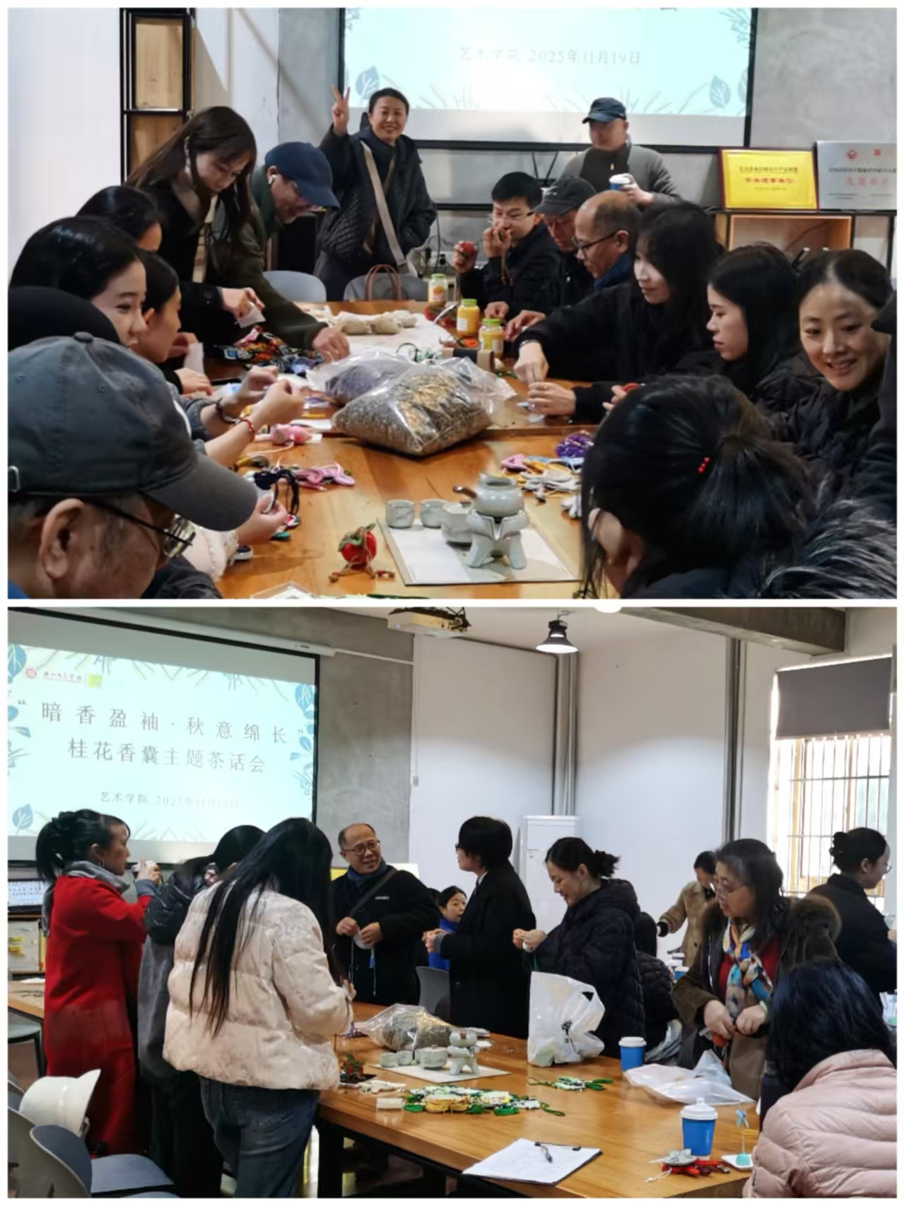 11月19日下午,我院分工会主办的“暗香盈袖·秋意绵长”香囊手作茶话会在教师发展中心15-203室举行。活动以花为媒、香囊为载,邀请全院教职工共赴一场秋韵与艺术交织的沉浸式体验。