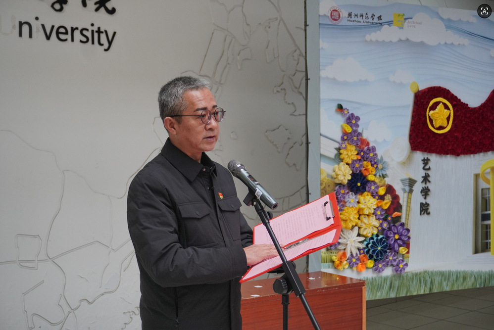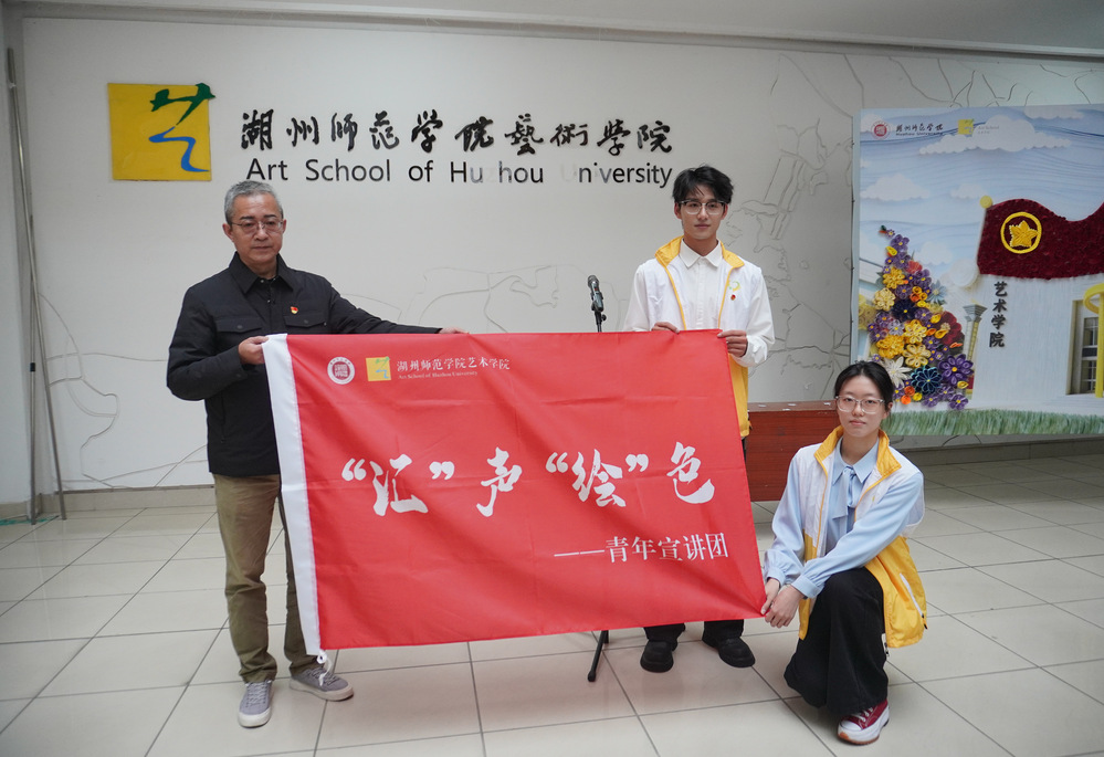 接下来,典礼主持人、学生会团委秘书长阚全博同学宣布湖州师范学院艺术学院“汇”声“绘”色宣讲团正式成立,简要介绍了该团队的主要工作,并由章晓强书记为宣讲团团长谭昊以及副团长季一诺授予旗帜。“汇”声“绘”色宣讲团成员将立足艺术学院专业特色,从湖州师范学院艺术学院出发,深入湖州各地,让青年主流声音“声”入人心,肩负起凝聚信念、引领思想的光荣使命,在未来成为我院思想引领工作中一道亮丽的风景线。