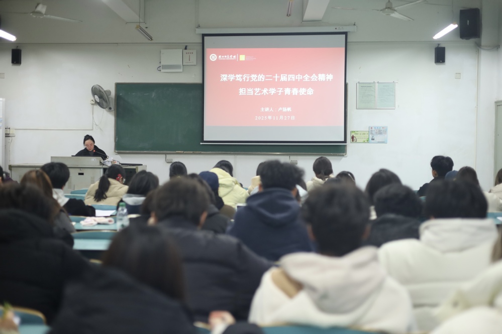 艺术学院卢扬帆老师紧扣党的二十届四中全会精神,深刻阐释了国家发展全局与艺术青年使命之间的内在联系。卢老师从全会绘制的宏伟蓝图出发,系统解读其目标导向与时代意义,强调国家发展与个人理想是“根与叶”的关系,相辅相成、共生共荣。她以“乡村振兴”战略为例,激励同学们深入基层、扎根人民,将艺术创作书写在祖国大地上;同时勉励大家秉持创新意识与工匠精神,精研专业、锤炼作品,使艺术实践成为中国式现代化进程中的生动注脚与青春华章。