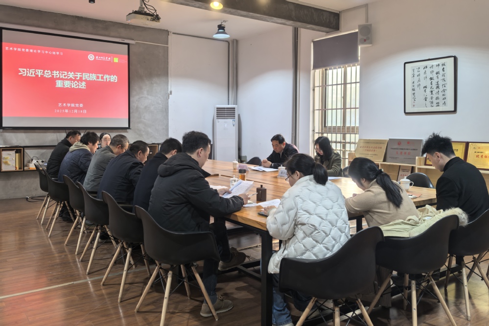 12月18日上午,艺术学院党委理论学习中心组在15-203会议室召开学习会,围绕“习近平总书记关于民族工作的重要论述”开展专题学习研讨。中心组成员、各师生党支部书记参加了学习。校党委副书记、联系领导陈永华,校党委委员、宣传部部长朱小芳到会指导。