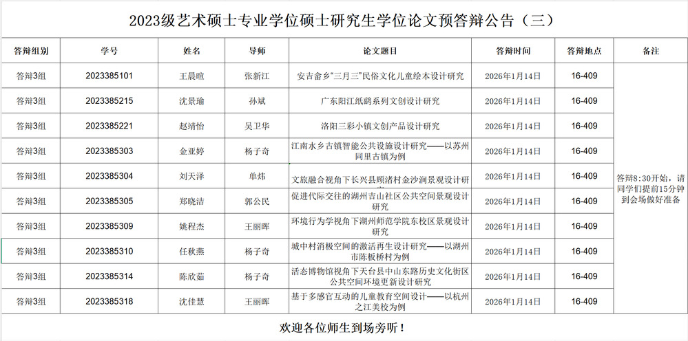 2023级艺术硕士专业学位硕士研究生学位论文预答辩公告(第2-3组)