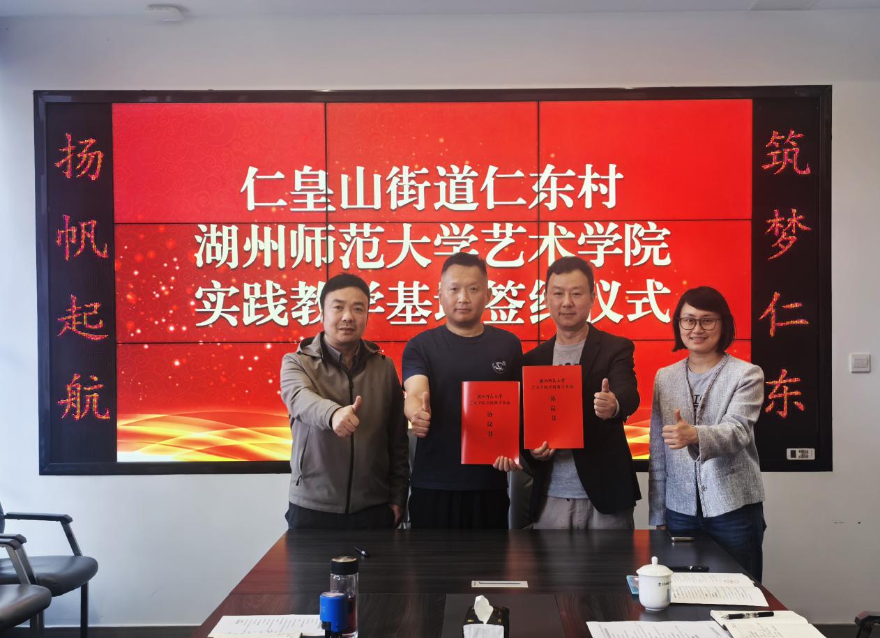 4月9日,湖州师范大学艺术学院与湖州市仁皇山街道仁东村集体经济组织举行“艺术学院环境设计系乡村共富实践教学基地”签约仪式。艺术学院副院长杨子奇、仁东村党委书记董飞代表双方签署协议,艺术学院环境设计系主任刘佳妮、副主任曾强参加签约仪式。签约后,双方围绕乡村微更新、人才培养、成果转化等议题开展深入会谈,就未来三年合作的具体内容达成共识。