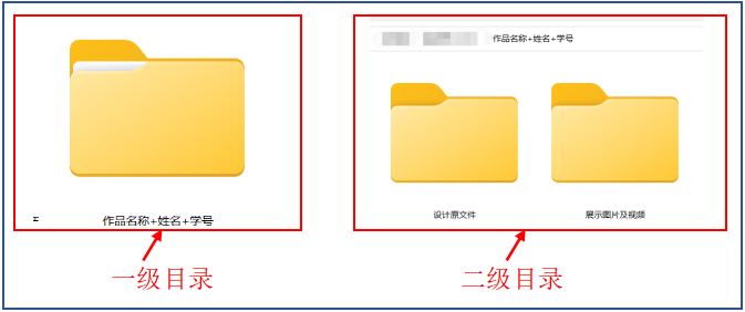 9.最终毕业设计材料提交:设计源文件,实物拍照、视频或者效果图两个部分。一级目录文件命名:作品名称+姓名+学号,二级目录分别命名:设计原文件和展示图片及视频(如图1),于5月12号前,由班级统一刻盘上交视觉传达设计系。